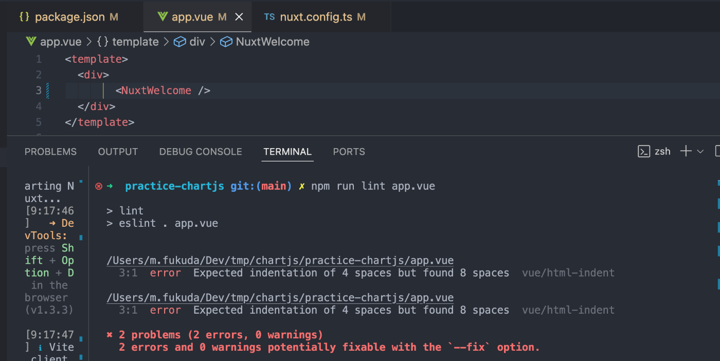 package.jsonにeslintコマンドを設定したのち、npm run lint app.vueを試すと、