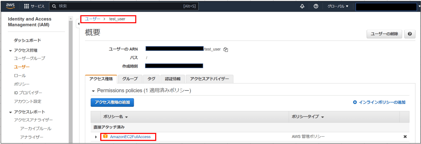 するとIAMコンソール画面から、対象IAMユーザー(test_user)に