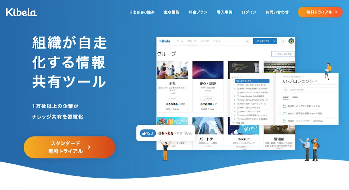 Kibelaは日本発のナレッジ共有ツールで、シンプルで使いやすいインターフェースが特徴です。社内WikiやQ&A機能に加え、ドキュメントのコメントやいいね機能でコミュニケーションを促進します。情報の更新履歴やバージョン管理も備わっており、ナレッジの継承に役立ちます。アクセス権限の設定も細かくでき、社外秘情報の管理に配慮されています。無料プランでは一定の容量まで利用可能で、中小規模のチームから大企業まで幅広く導入されています。