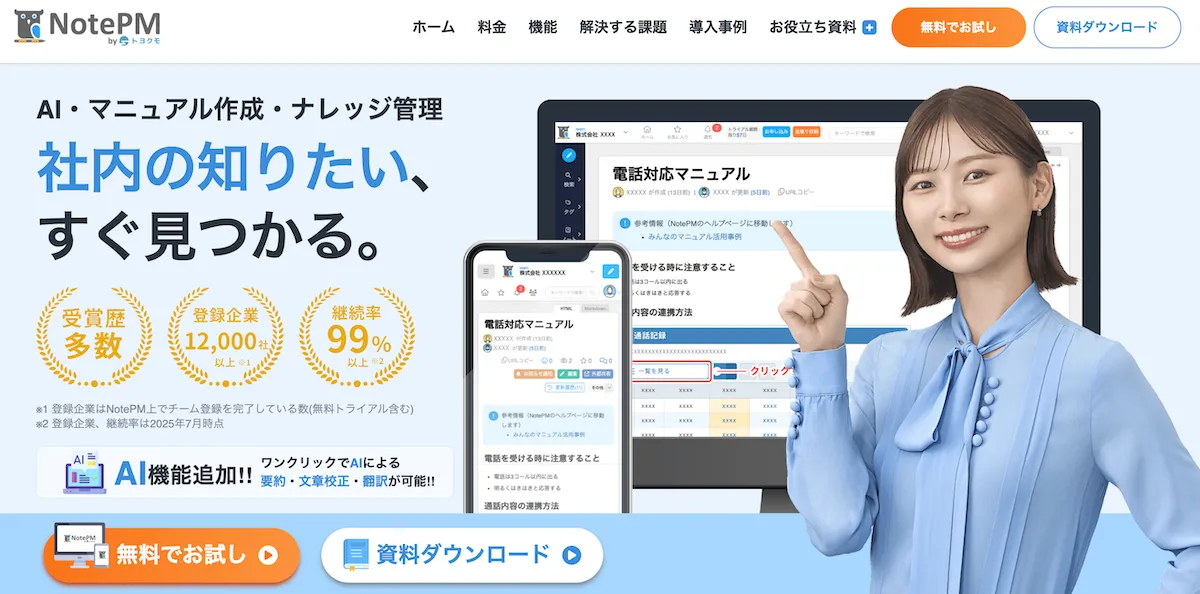 NotePMは、社内の「知りたい」がすぐに見つかるナレッジ共有ツールです。ドキュメントやマニュアルの作成・管理が簡単にでき、テンプレート機能で統一感のある資料作りができます。
