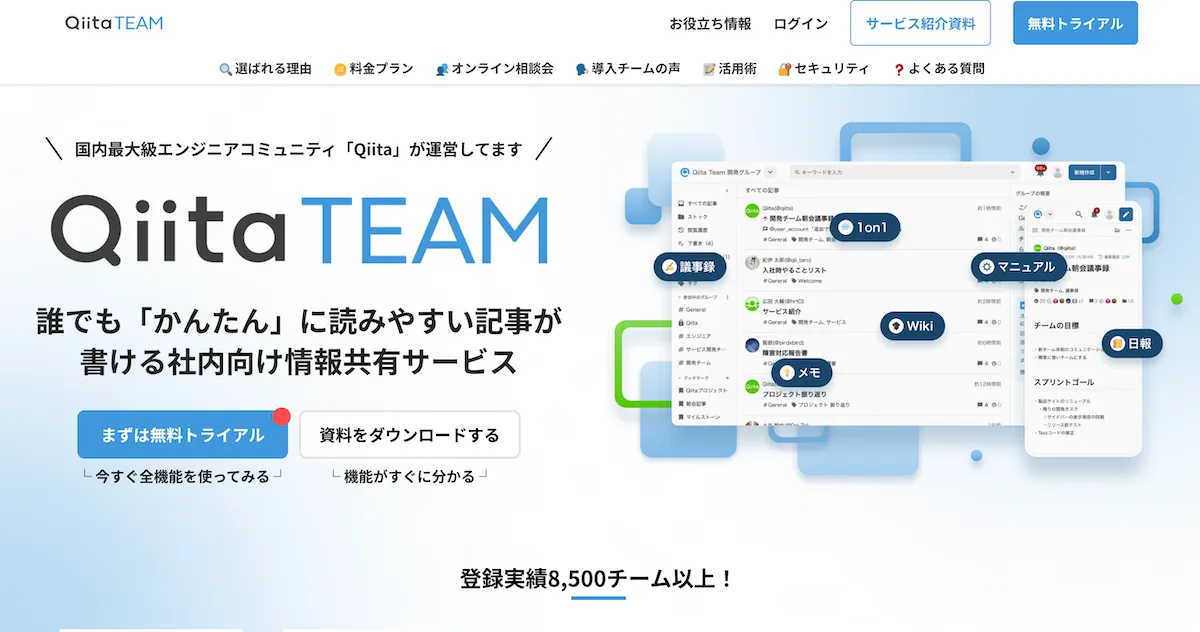 Qiita Teamは、誰でも「かんたん」に読みやすい記事を書けることを目指した、社内向けの情報共有サービスです。国内の大手企業をはじめとして、8,500チーム以上の登録実績があります。