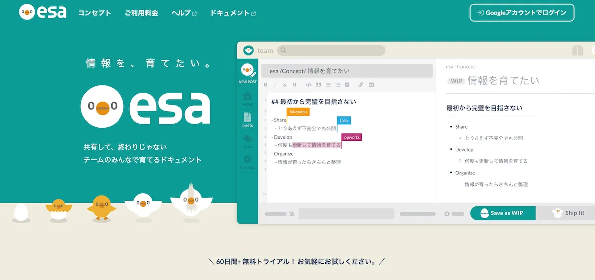 シンプルなUIで記事を見つけやすく、グループごとの紐付けやタグ付けなどの機能によって、記事の管理がしやすくなっています。GitHubやSlack、Chatworkなどとの連携に対応しているため、部署内や部署間での情報共有を円滑にします。セキュリティ面も考慮されており、アクセス権限やグループ管理も可能。無料トライアルも提供しているので、気になる方は一度試してみてください。