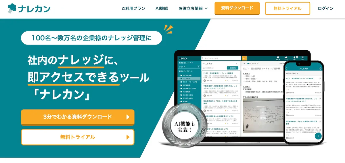 ナレカンはシンプルな社内ナレッジ共有ツールで、ナレッジにすぐにアクセスできるようになっています。社内のあらゆる場所に散在するナレッジを一元管理でき、高度な検索や重複判定、不要な情報の整理(断捨離)機能により、ナレッジの活用と管理をスムーズに行えます。