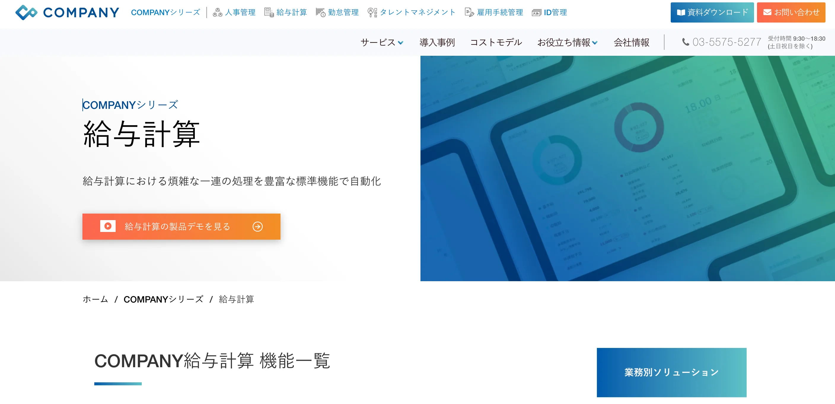 COMPANYでは、給与計算に関する複雑な業務を、様々な機能で自動化できます。例えば、月例給与や賞与の計算、福利厚生制度、社会保険、年末調整や税計算、退職金や企業年金などの計算機能です。