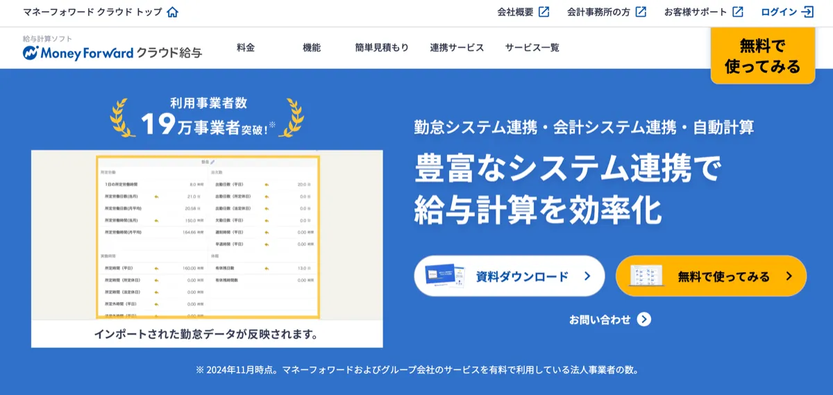 マネーフォワードクラウド給与は、クラウド型の給与計算ソフトで、最新の税制に対応した機能を提供しています。利用事業者数は19万を突破。勤怠集計や自動計算、Web明細の発行などが可能です。また、他社サービスとの連携や、銀行との振り込み連携、支給額や控除額の計算も自動で行えるため、日々の業務工数を大幅に削減することができます。