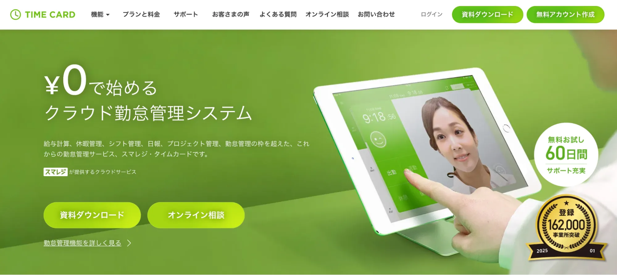 スマレジ・タイムカードはクラウドベースの給与計算ソフトウェアで、特に勤怠管理機能に優れています。登録事業者数は167,000を突破しています。このツールでは従業員の出退勤データをリアルタイムで記録し、給与計算に必要なデータを自動的に取り込めます。