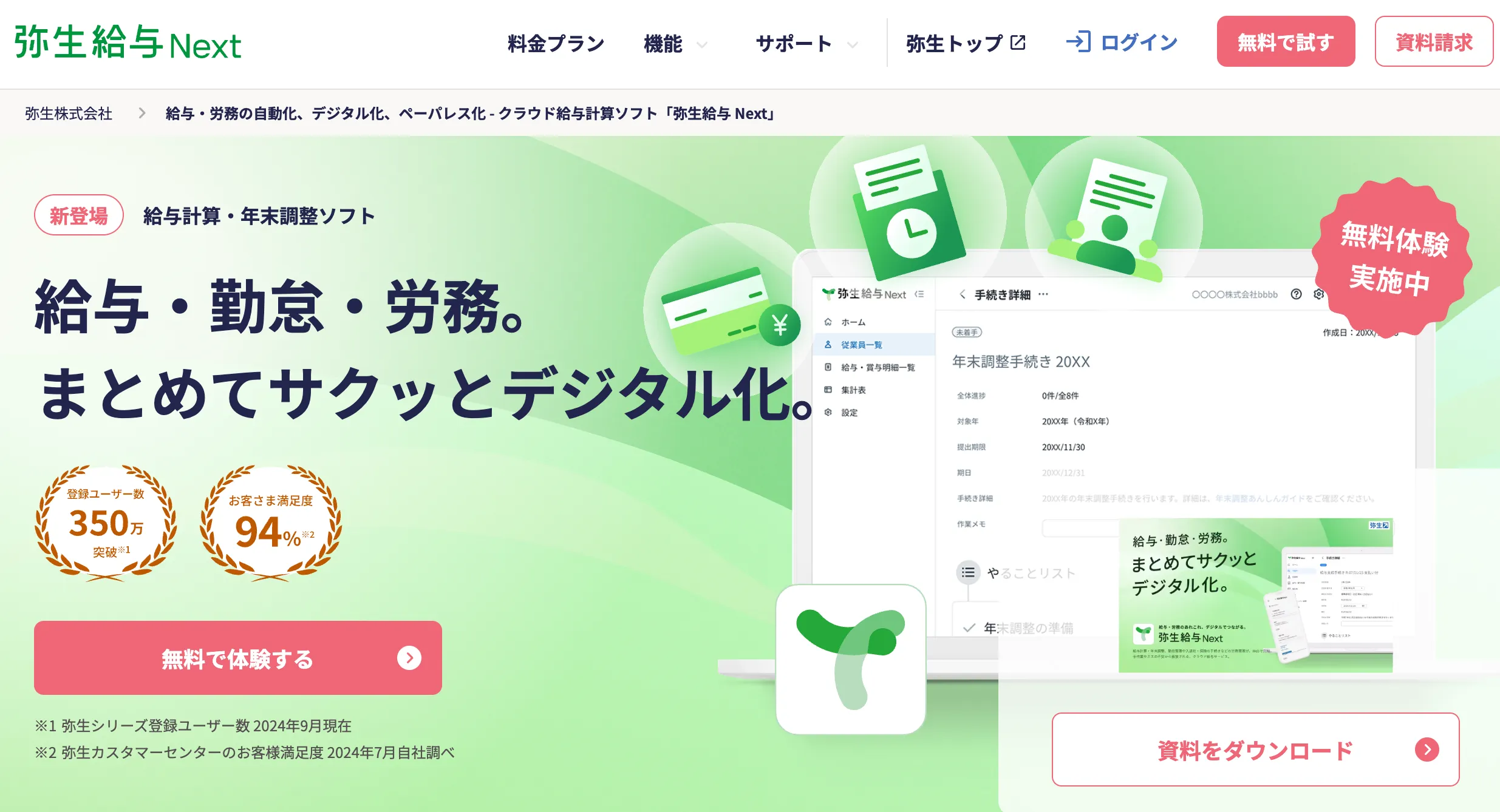 弥生給与 Nextは、日本の中小企業・個人事業主向けに会計・給与・販売管理などの業務ソフトを提供する弥生株式会社が提供する、給与計算ソフトです。登録ユーザー数は350万を突破しています。