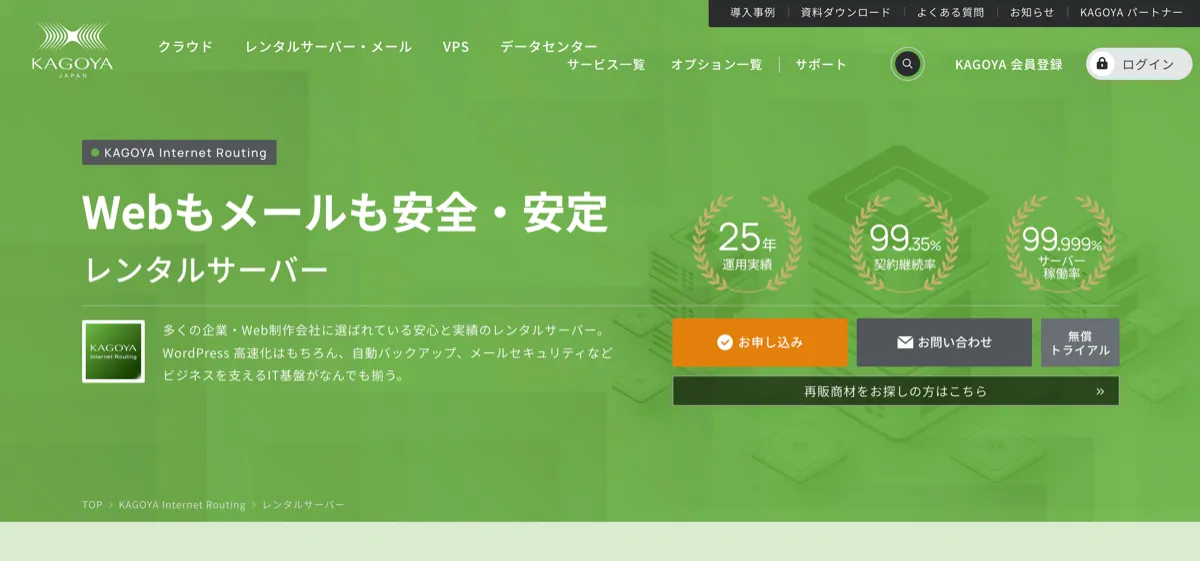 KAGOYAは、耐震・免振設計の自社データセンターを災害に強い立地に持ち、高いセキュリティと安定性を追求している、老舗のレンタルサーバーです。特に、ビジネス利用やカスタマイズ性の高い環境を求めるユーザーに支持されています。