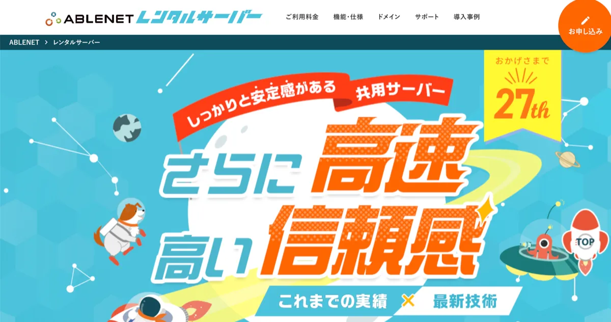 ABLENETレンタルサーバーは、高いコストパフォーマンスと老舗ならではの安定した技術基盤を持つレンタルサーバーです。特に、高性能なVPS(仮想専用サーバー)サービスも提供しており、リソースを柔軟に利用したいユーザーに選ばれています。