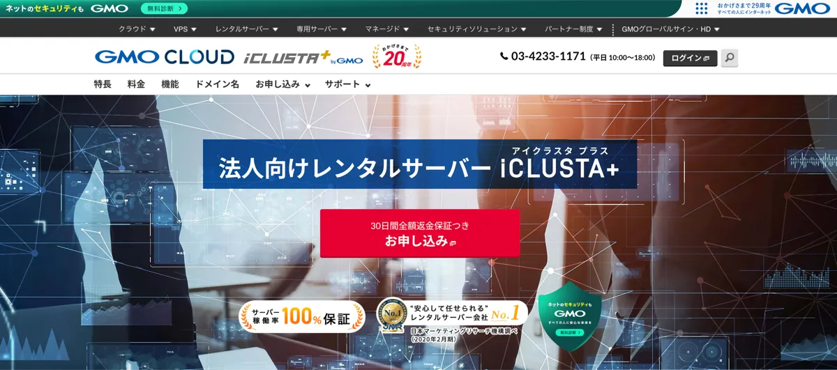 iCLUSTA+(アイクラスタプラス)は、法人向けのレンタルサーバーです。ビジネス用途に特化し、高い安定性と手厚いサポートを提供しています。国内最大手のGMOグループが運営しており、信頼性の高さも魅力です。