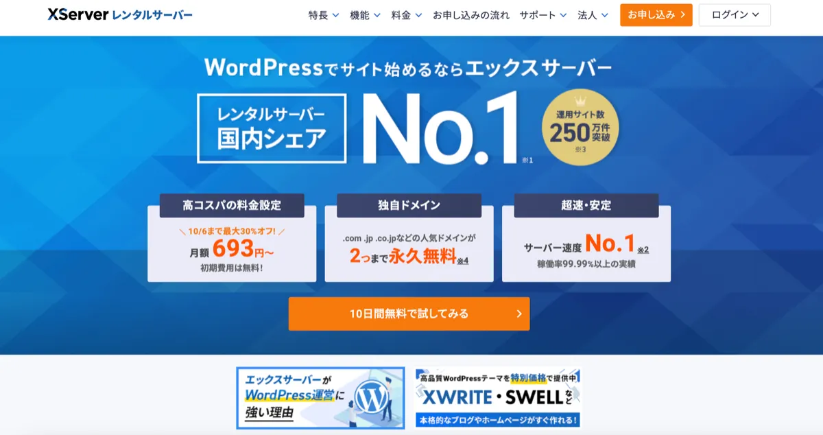 エックスサーバー は、国内トップクラスの高速性と安定性を兼ね備えた、個人から法人まで幅広く支持される代表的なレンタルサーバーです。Webサイトの表示速度を徹底的に追求しており、全ストレージに高速インターフェース「NVMe SSD」と、独自機能でサイト表示を高速化する「Xアクセラレータ」を搭載しています。そのためWordPressのような動的サイトでも快適な動作を実現しています。