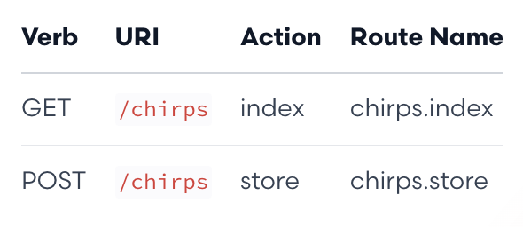 というリクエストを送ったりしてきます。このリクエストに対応するコントローラを指定する必要があります。プロジェクトのroutesディレクトリで管理される "routes "を追加することでこれを行うことができます。リソースコントローラという仕組みを使用しているので、1つのRoute::resource()ステートメントを使用して、従来のURL構造に従ってすべてのルートを定義できます。すなわちGET /chirps とすれば一覧で表示されたり、POSTで新規追加されたりなど決まったルールにはなりますがRoute::resourceと書くだけで全てのアクションが定義されるのです。