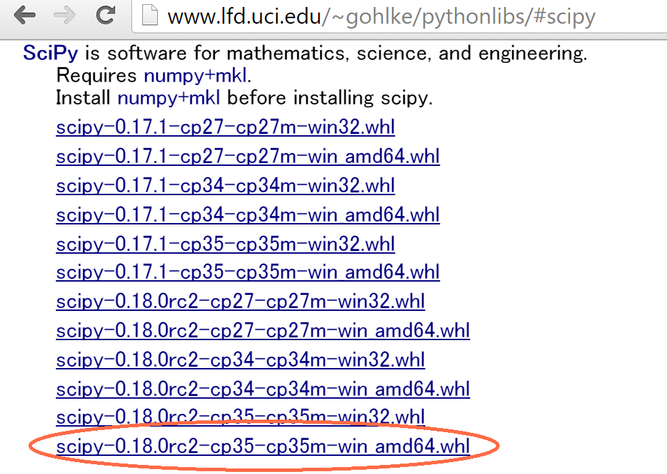 筆者はWindows10(64bit), Python3.5系なので scipy-0.18.0rc2-cp35-cp35m-win_amd64.whl をダウンロードしました。