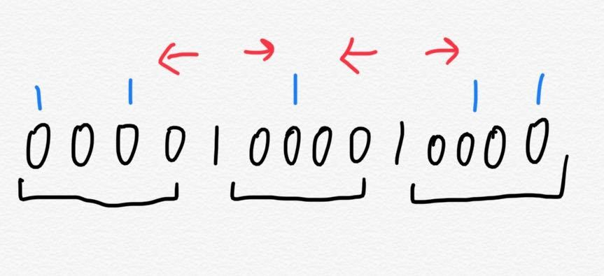 - 真ん中のケースを考える。端でない連続した0の区間はその区間に含まれない1つ隣が1であることは自明である。そのため、両端は必ずkの距離を空けないとならない。