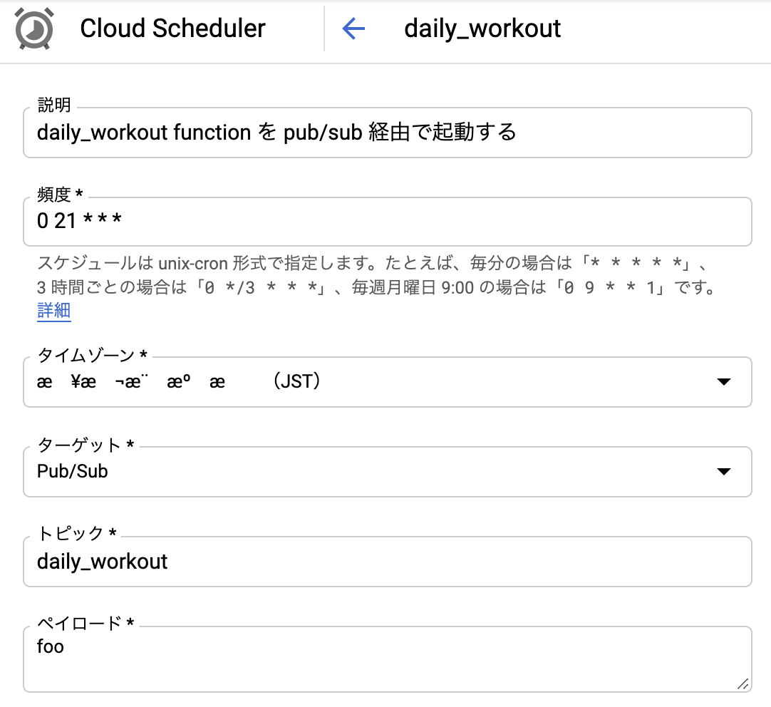 日本時間毎日 21:00 に Cloud Pub/Sub に向けて daily_workout というトピックでメッセージを Publish する、という設定です。