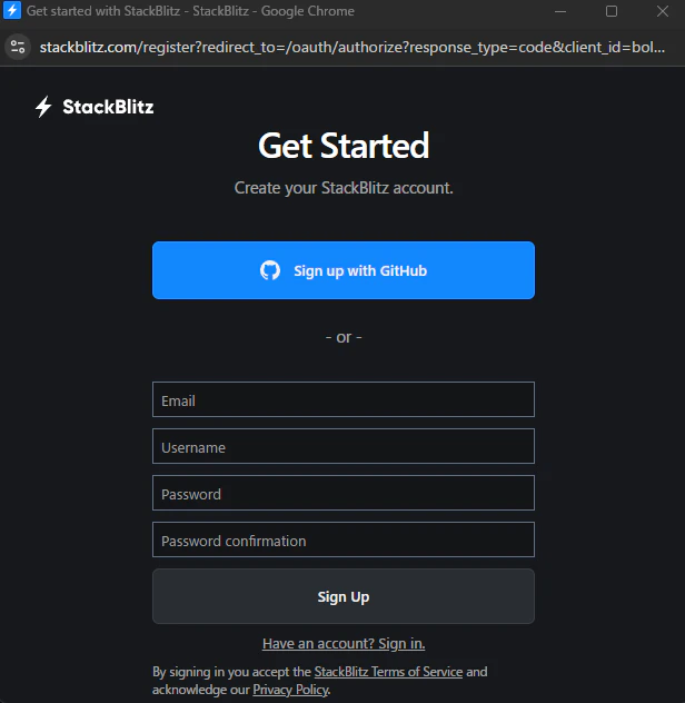 そうすると、ダイアログが表示されるため、「Continue with Github」でGithubと連携してログインするか、「Don't have an account? Create one here.」のリンクをクリックしてメールアドレス、ユーザ名、パスワードを入力してアカウントを作成してください。