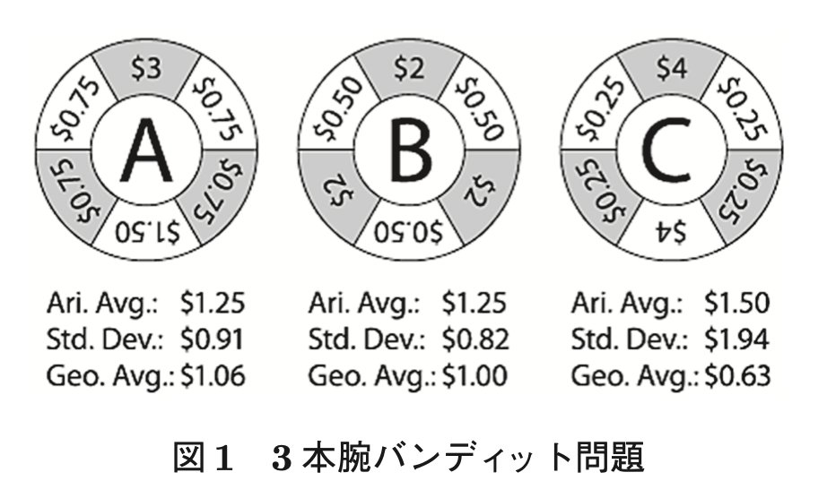 利益率の複利効果を理解するために、3本腕のバンディット問題を考える。あるカジノに下記のような3台のマシンが置いてある。