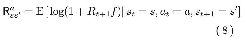 ここで、Pas s'は状態sにおいて行動aを行った時に次の状態がs'になる確率で、Ras s'は、状態sにおいて行動aを行ってつぎの状態が s′になったときに得られる利益率Rfに1を加えたものの対数の期待値以下であり、以下で表される。