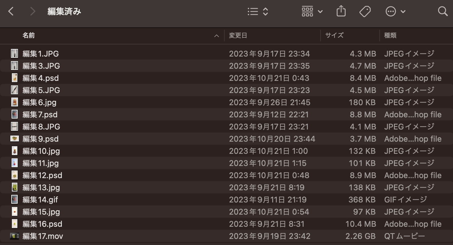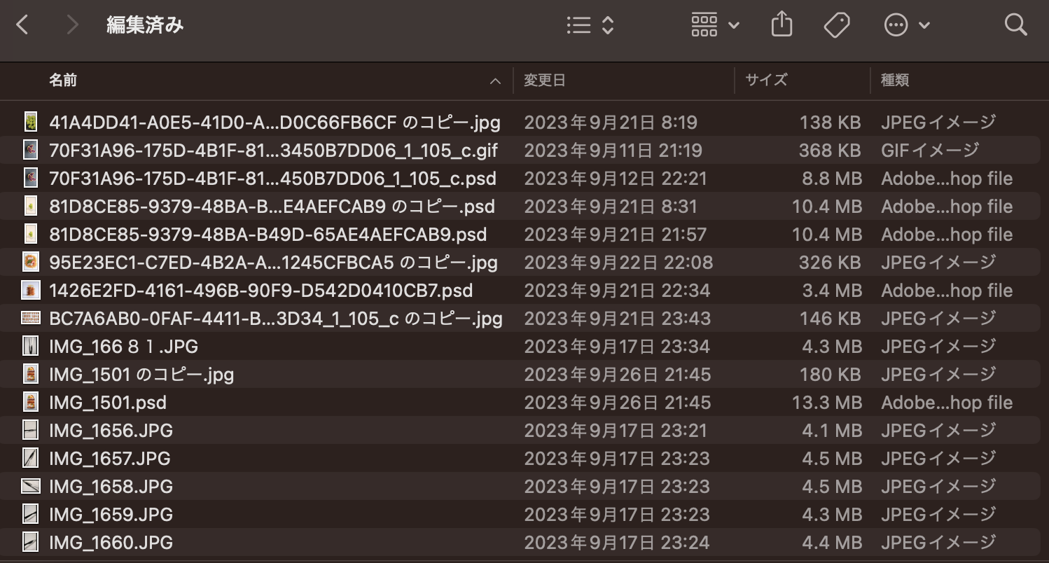 このバラバラな名前とファイルの種類を「編集+数字」にしたい。