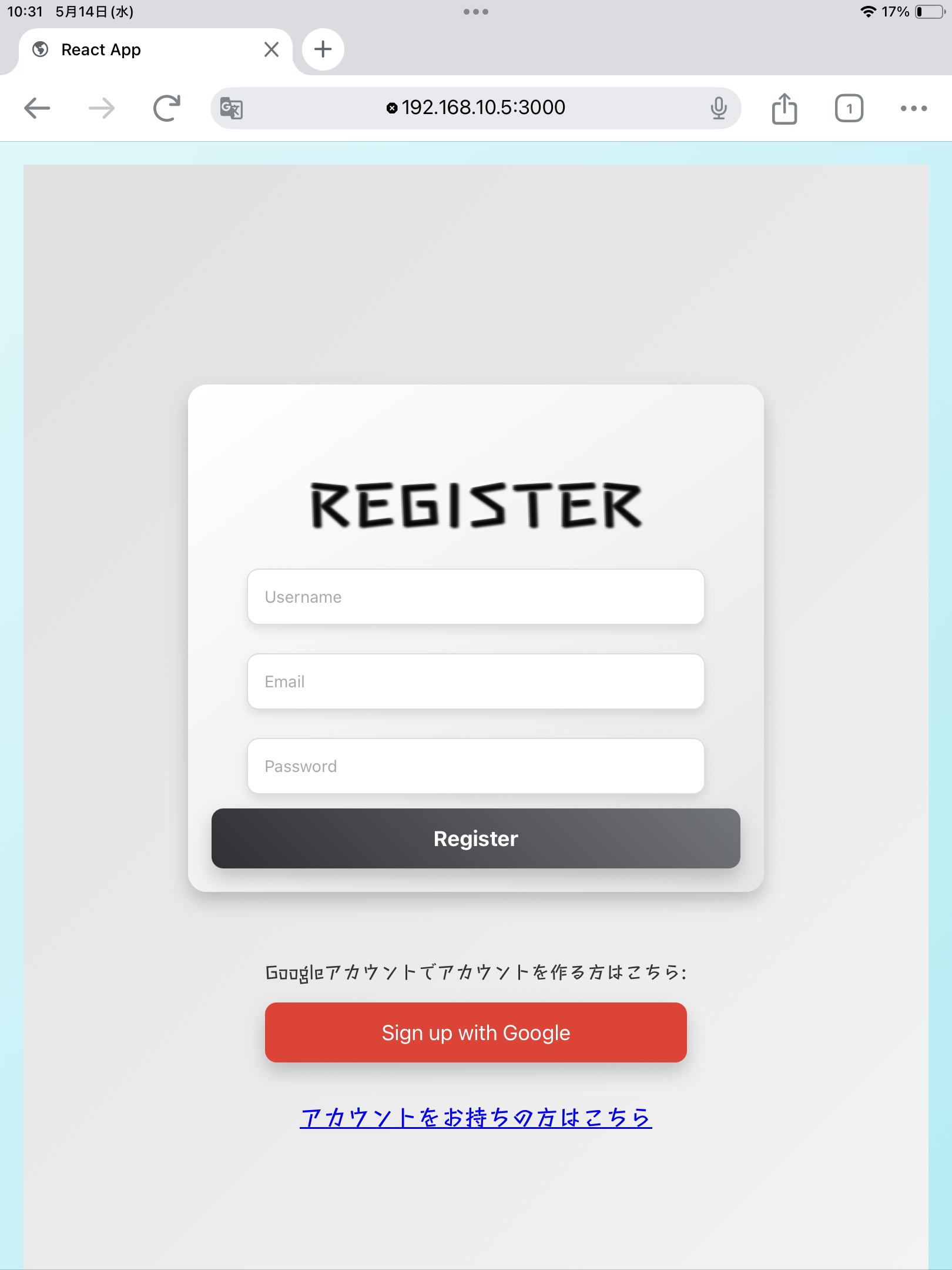 起動すると最初はregisterページに飛ぶようになっています。アカウントがある人はログインページに遷移できるようになっていて、アカウント認証はFirebaseの標準機能をそのまま使っています。