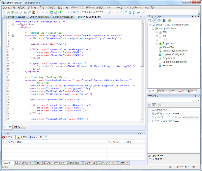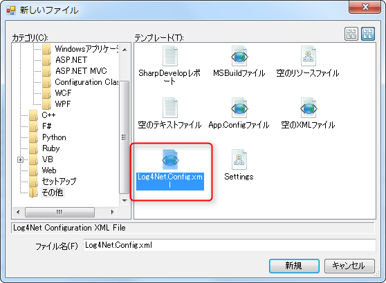 先日書いたLog4Net.Config.Xmlファイルですが、SharpDevelop から一発で追加できるようにしたい!