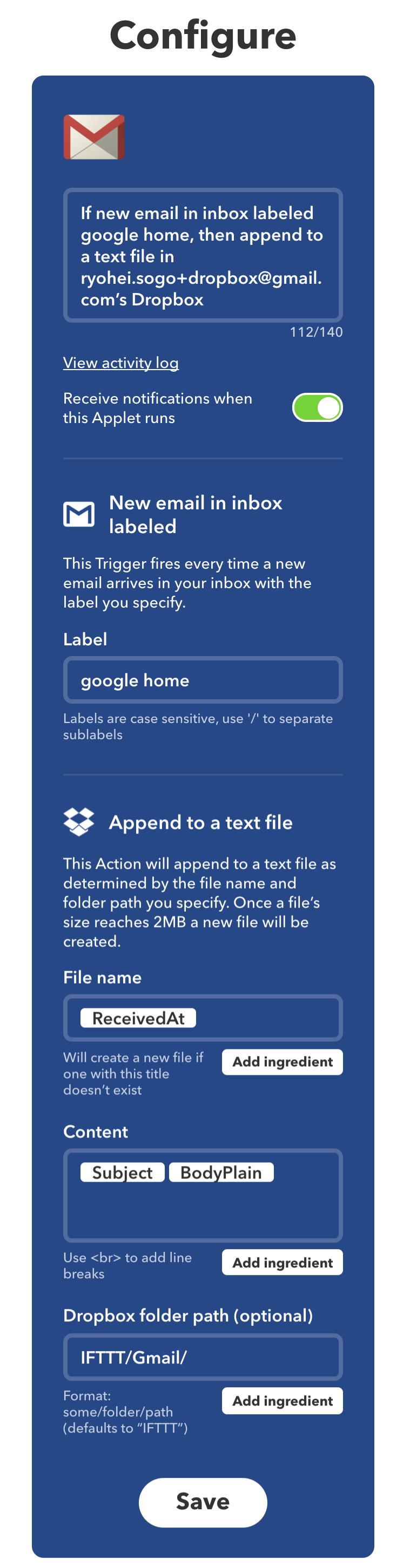 IFTTTでは、特定のタグ付されたメールが届くと、Dropboxにそれを置くようにしました。
