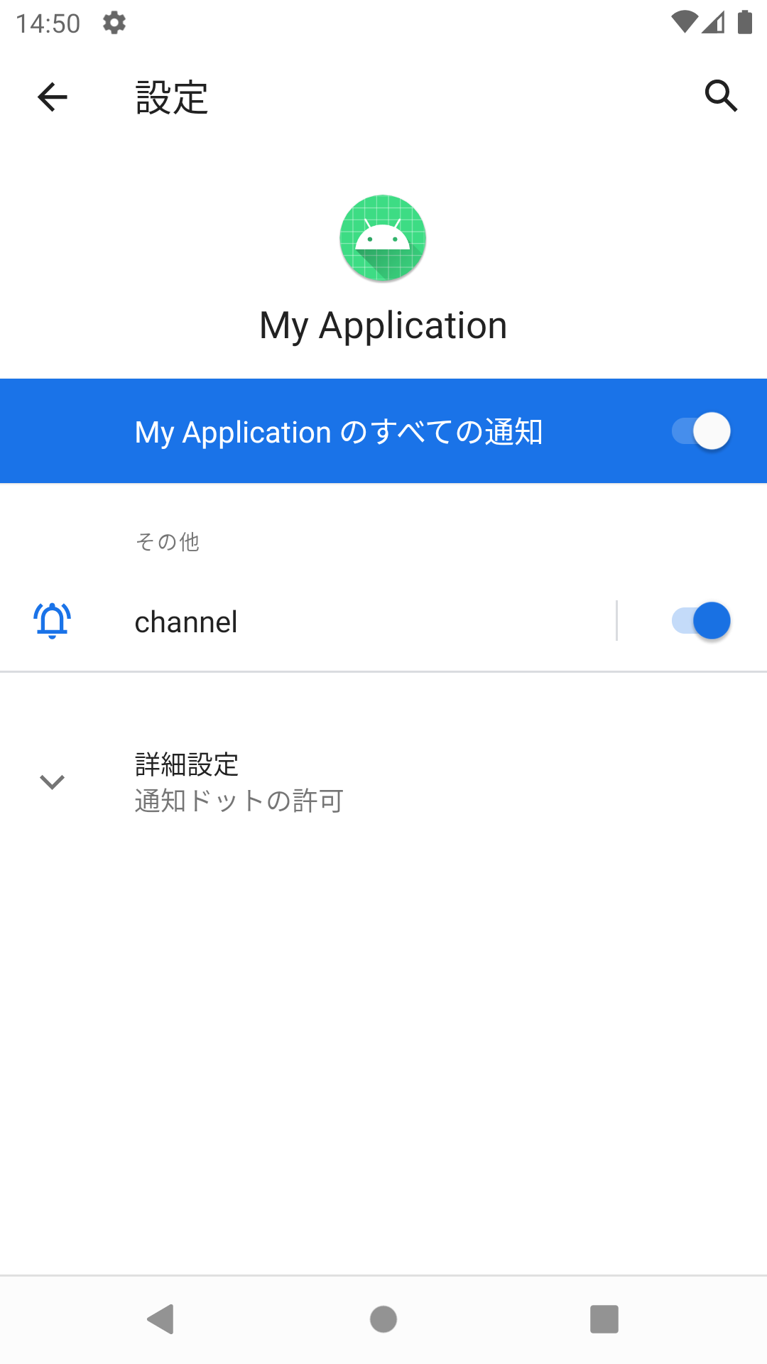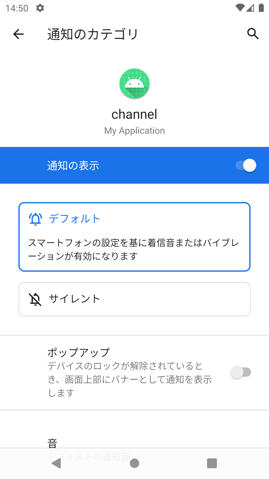 NotificationChannelの表示の仕方はOSバージョンや、メーカーのカスタマイズによって変わってきますが、以下のようになります。