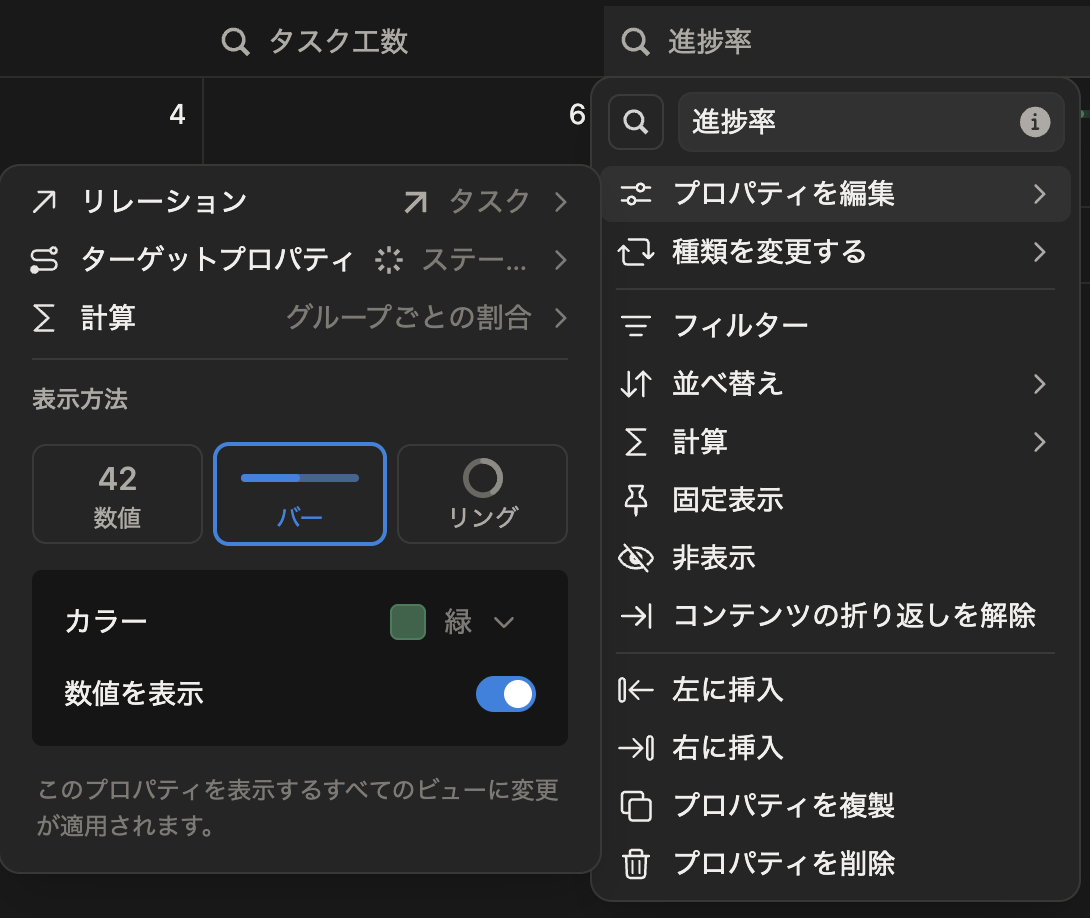 - 目的:「そのリリースに含まれるタスクの進捗率(完了ステータスのタスク数/全てのタスク数)」を表示する