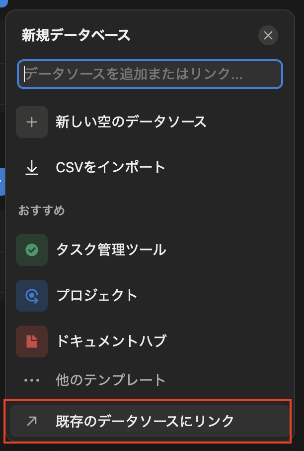 ②「既存のデータベースにリンク」で紐付けたいデータベースを選択
