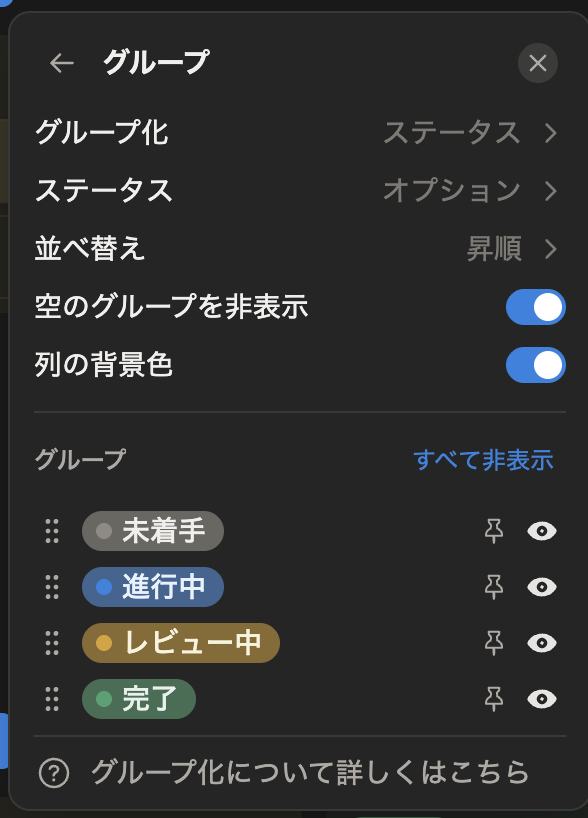 【グループ化】でベースとなるプロパティを選択することができる他、値毎にボードへの表示/非表示を設定することもできます。