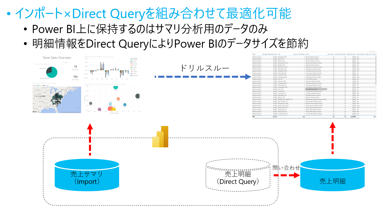 一般的に集計されたテーブルの行数<<集計前のテーブルの行数なので、サイズの大きい集計前のテーブルはDirect Queryモード 、サイズの小さい集計結果はImportモードという形で、テーブルごとに異なるストレージモードを設定する複合モデルによる構成が考えられます。