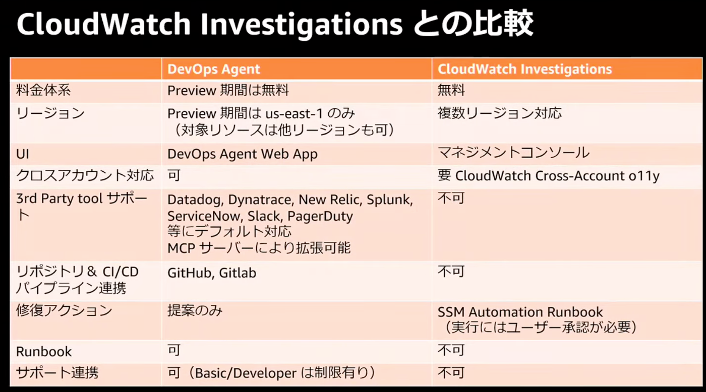 そして、DevOps Agentとの比較が完結にまとめられていて、自分自身が感じていたものを言語化してもらいスッと入ってきました。