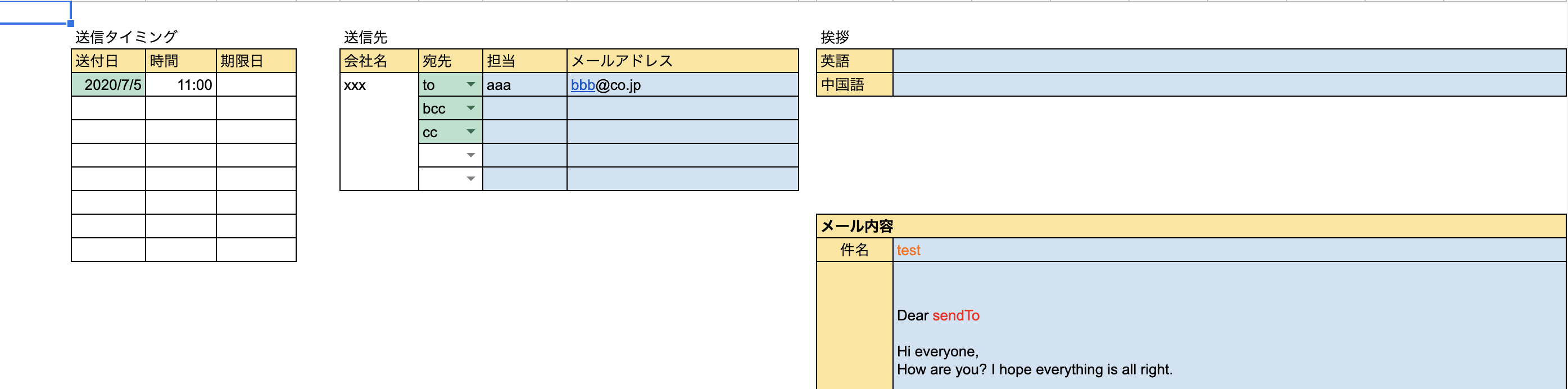 スプレッドシート上に以下の項目を記入しておくと、指定した内容でメールが送信されます。