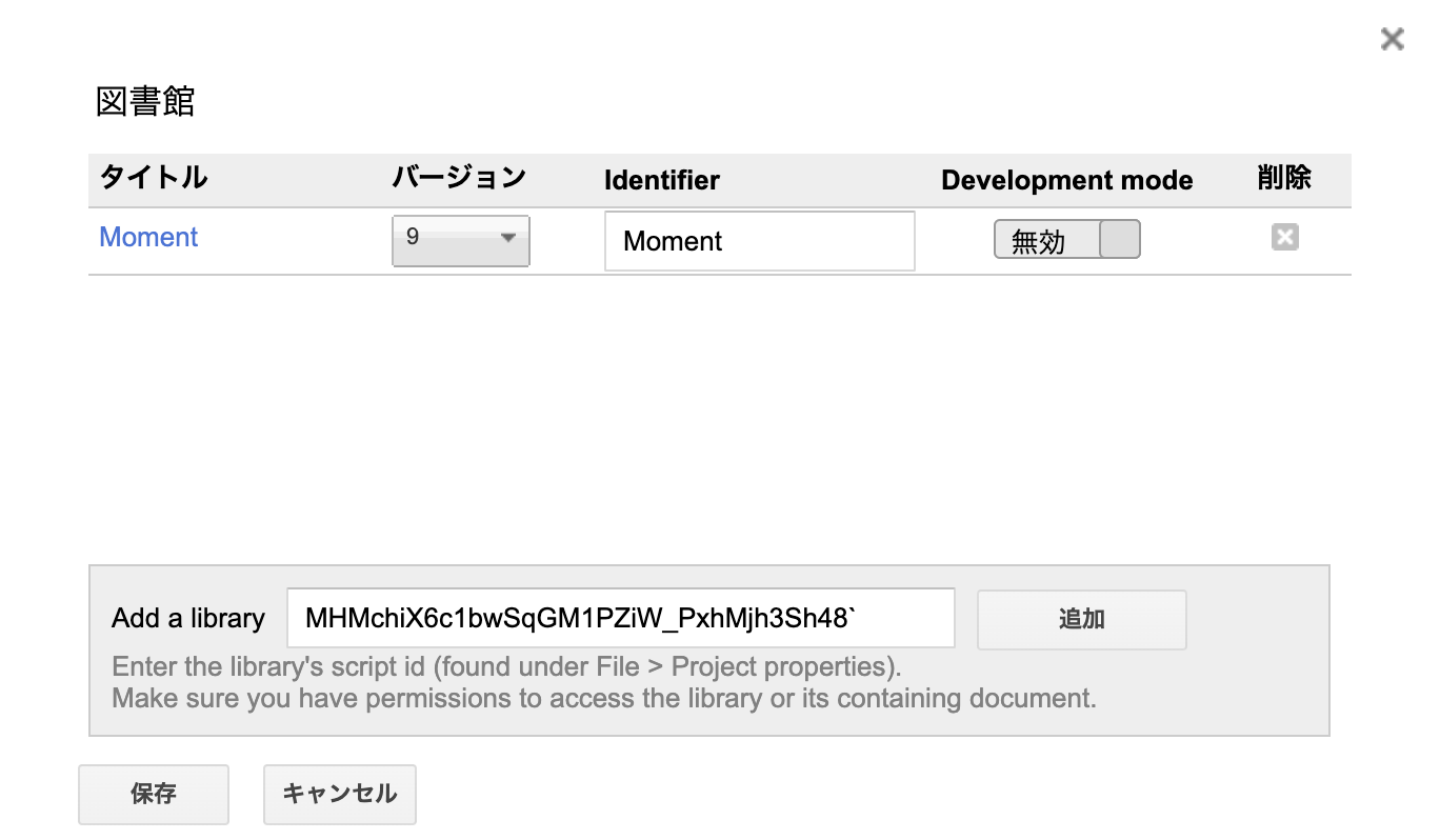 「Add a library」部分にMHMchiX6c1bwSqGM1PZiW_PxhMjh3Sh48を指定して「追加」を選択します。