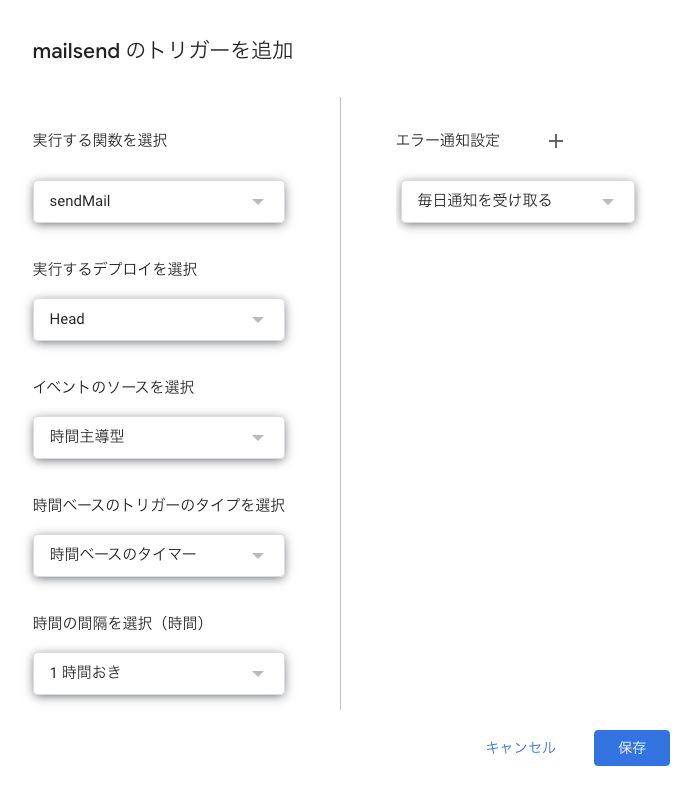 Apps Script ダッシュボードからマイトリガーで以下の通り設定します。