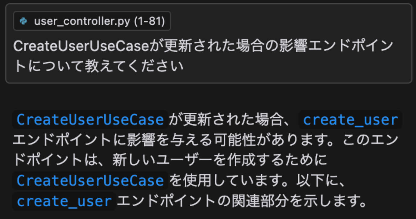 CreateUserUseCaseを変更した場合は、userを作るエンドポイントが影響範囲であることが出力されました。