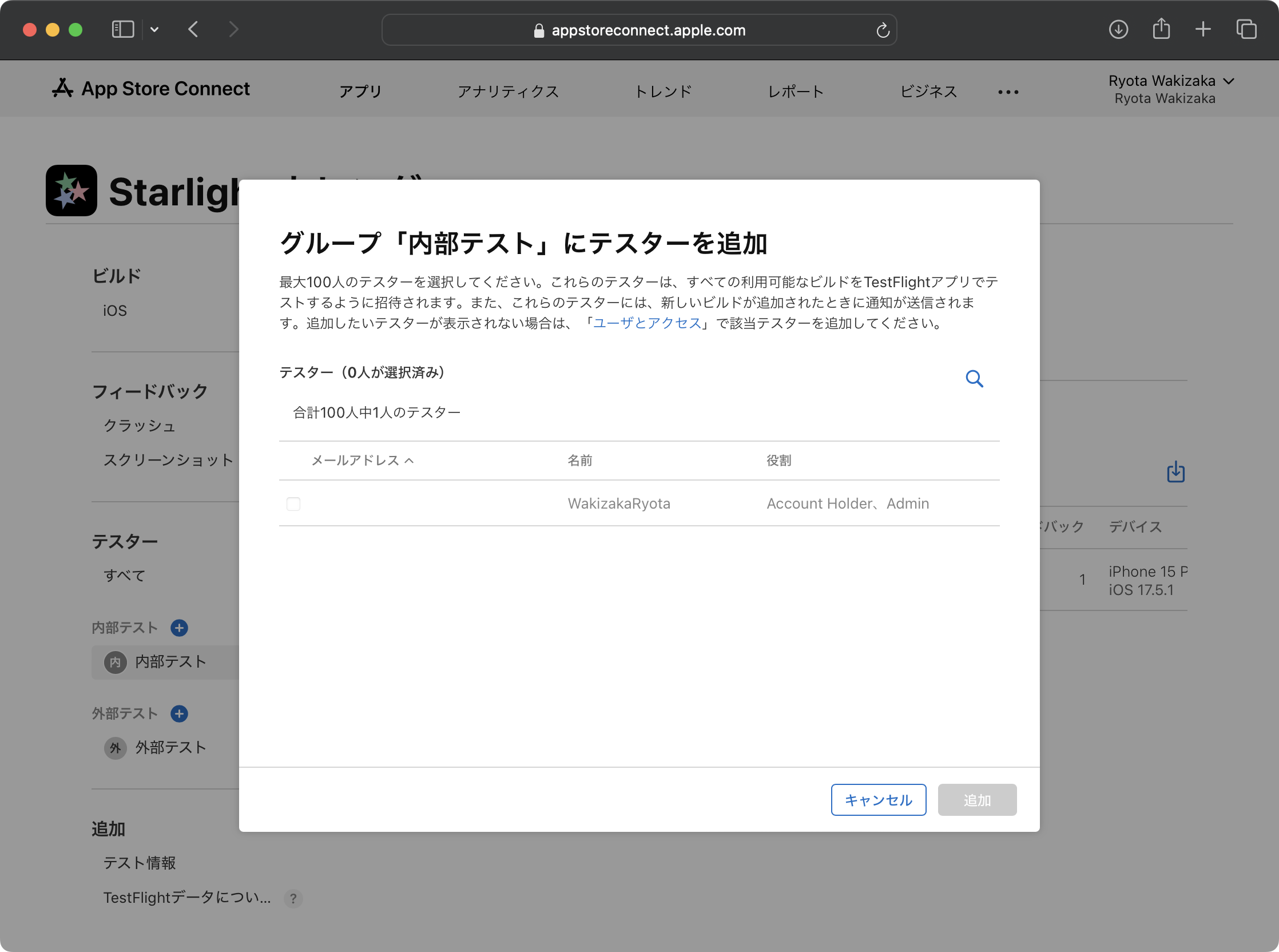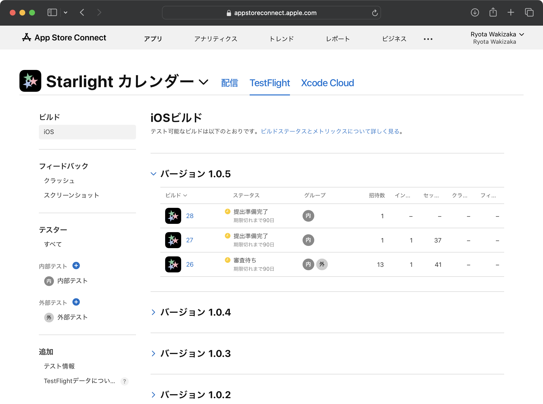10-1. TestFlightタブからアップロードしたアプリを確認する。