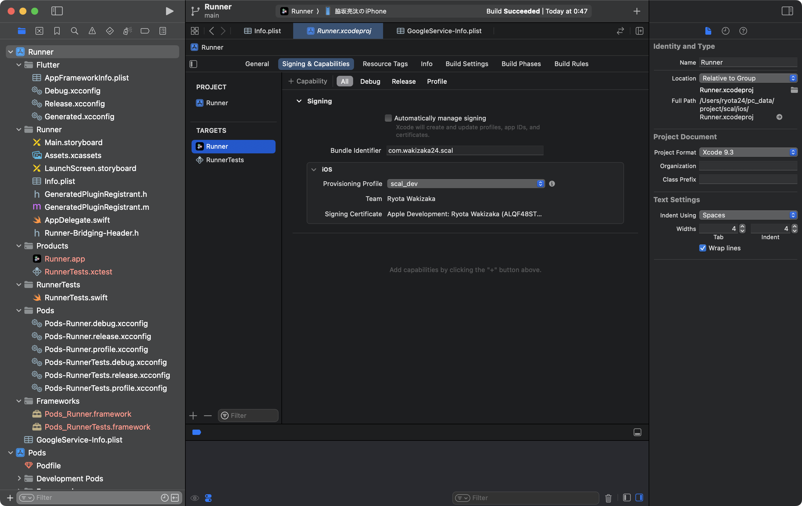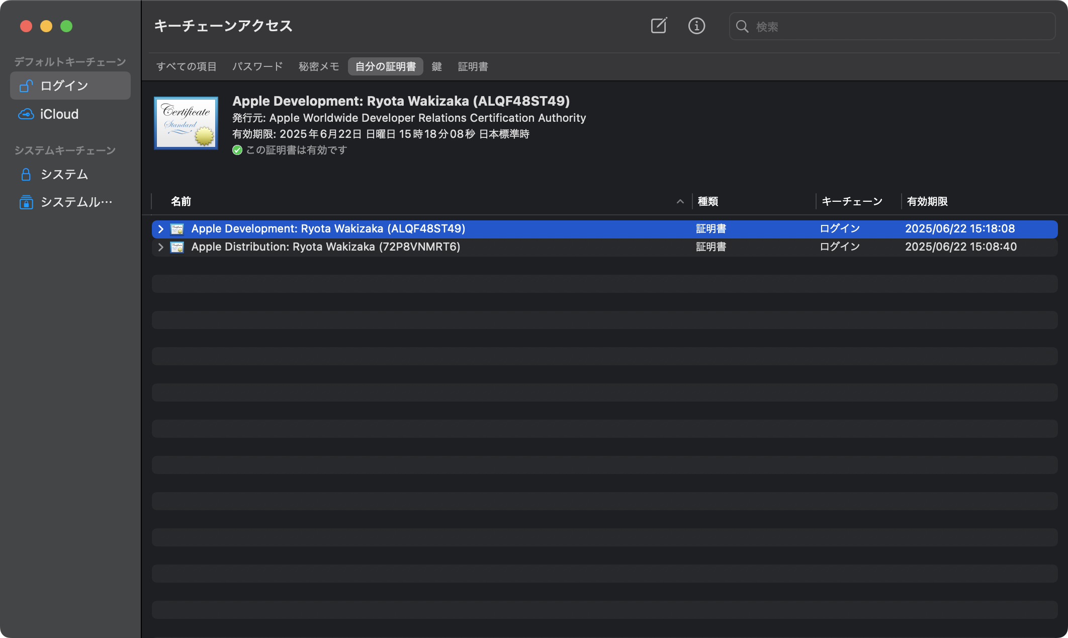 Apple Developerから開発者と配信者の証明書と、それに紐づくプロビジョニングプロファイルを作成します。詳細は割愛します。