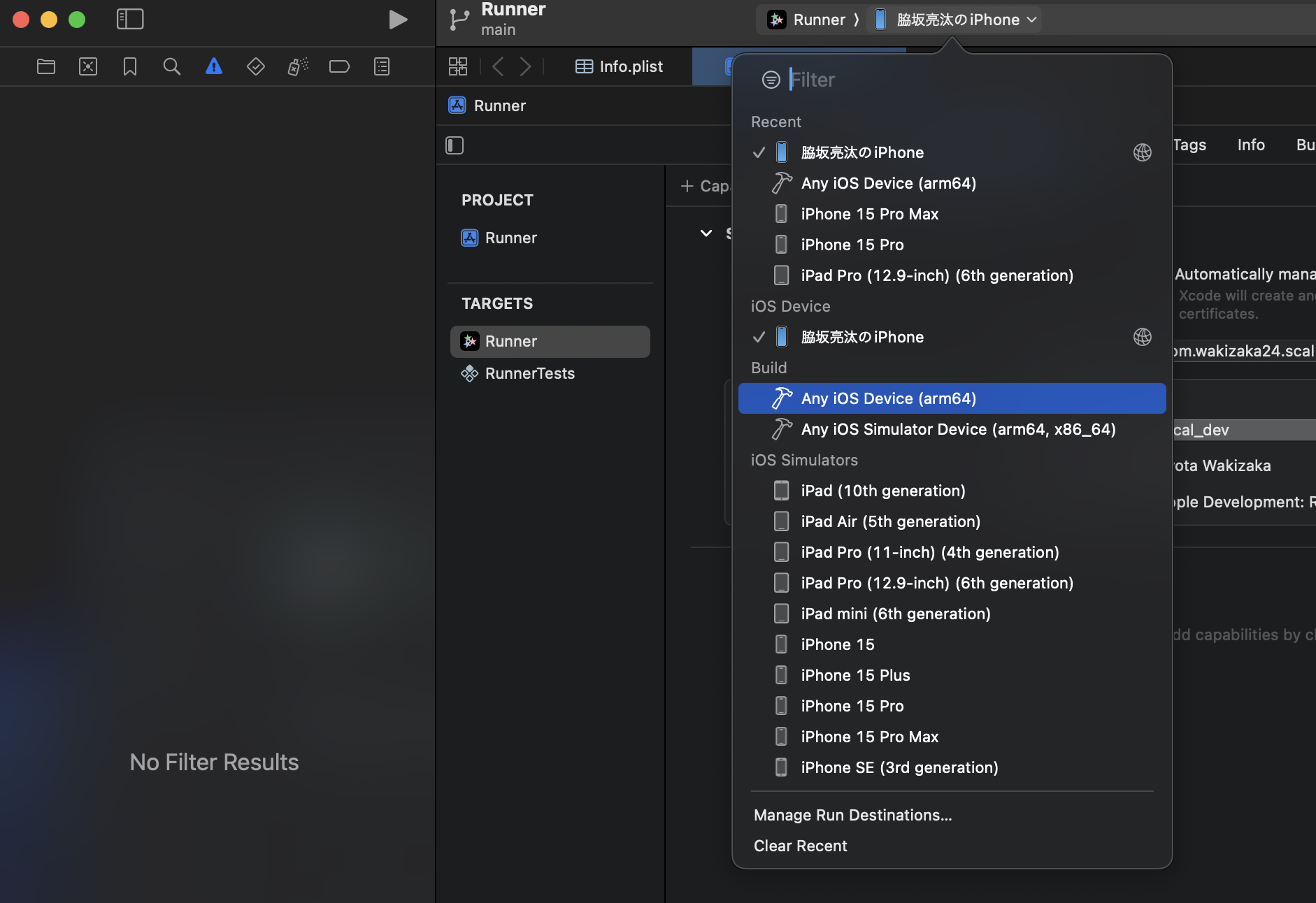 6-1. ビルド対象を「Any iOS Device (arm64)」に変更する。
