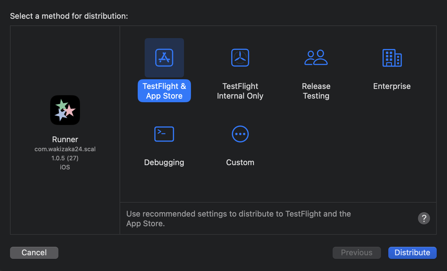 6-4. Testflight & App Storeを選択し、Distributeを押す。