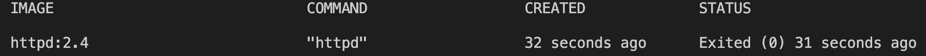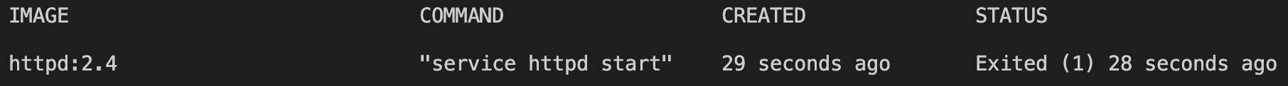 COMMANDの欄がservice httpd startになっていてstatusがすぐにExitedになりました。serviceコマンドが終了したとほぼ同時にコンテナが停止しました。