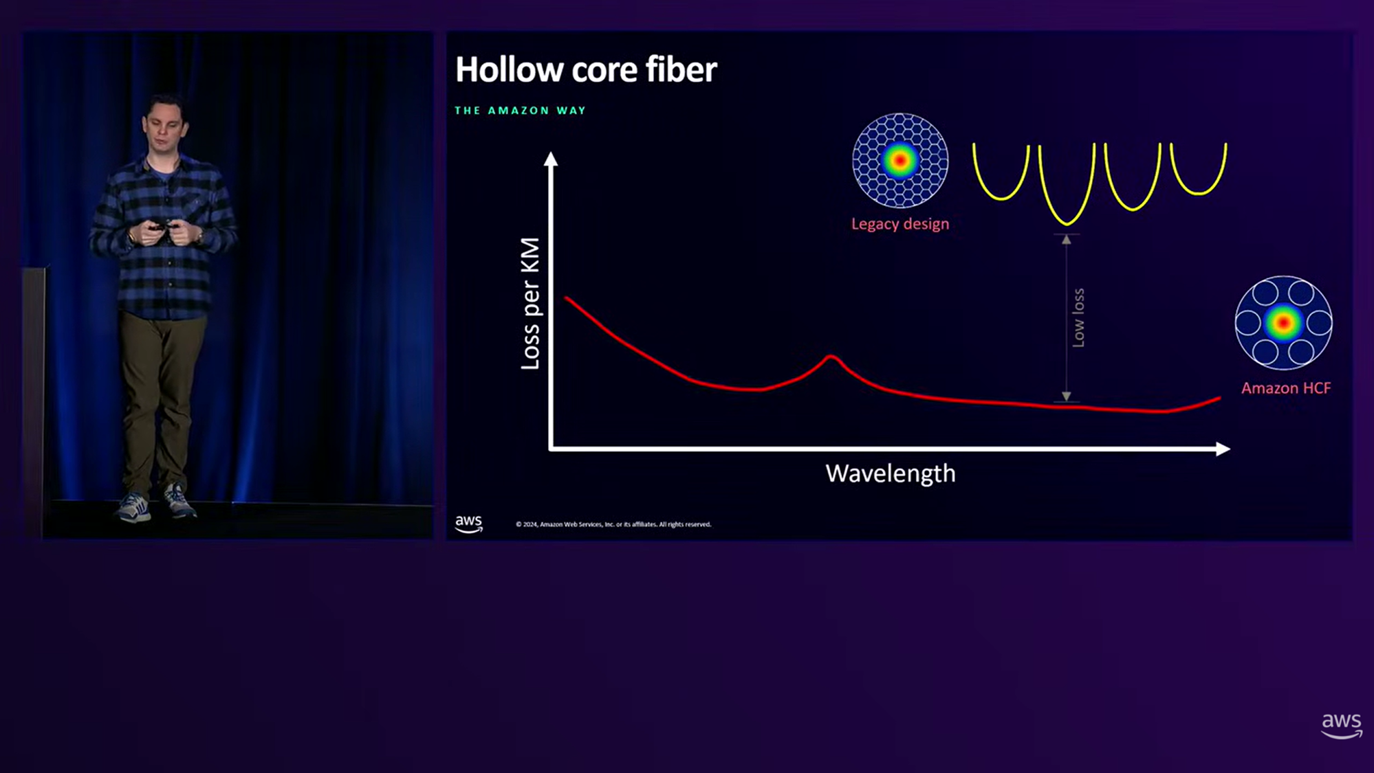 AWSはAWS re:Inventというイベントにて、空孔コアファイバに触れています。"Amazon Hollow Core Fiber"呼ばれているところからも、自分たちでデータセンタ間通信に使うための空孔コアファイバを開発しているそうです。
