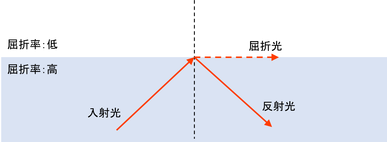 全反射とは、屈折率の高い媒質から小さい媒質に光が入射するとき、臨界角以上の入射角だと光が全て反射する現象のことです。