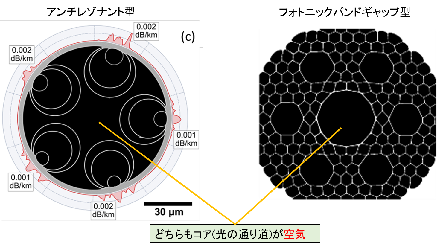 | 2つのタイプの空孔コアファイバ(アンチレゾナント型とフォトニックバンドギャップ型) |