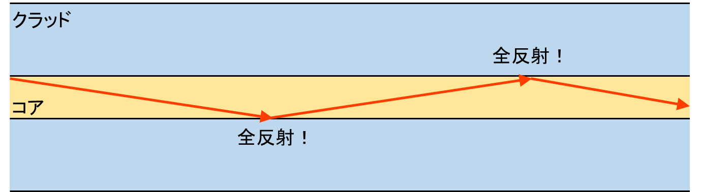 この仕組みを光ファイバ内のコアとクラッド によって実現します。