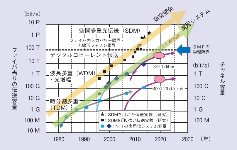 - 現行のシングルモードファイバでは、その構造に伝送容量と遅延の側面に物理的限界が存在する