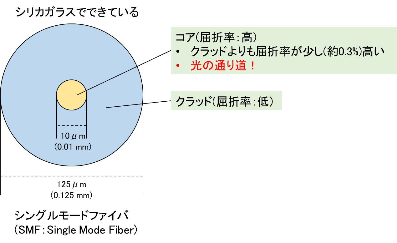 現在広く使用されている光ファイバはシリカガラスによってつくられています。その内部はコアとクラッドと呼ばれる2層の構造になっています。コアは実際に光が通る道ですが、これはクラッドよりもわずかに(約0.3%)屈折率が高くなっています。これによって、コアとクラッドの境界で全反射が起こり、光が進みます。