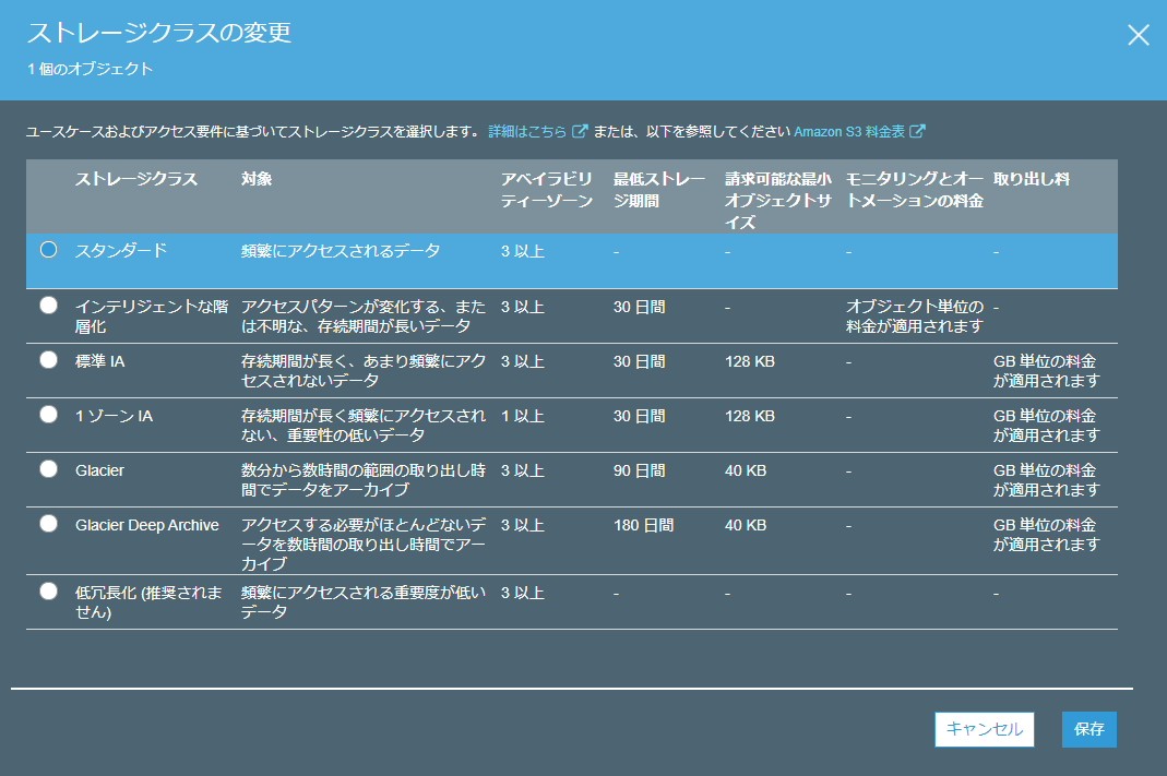 S3上のオブジェクトの「ストレージクラスの変更」ダイアログでの表示