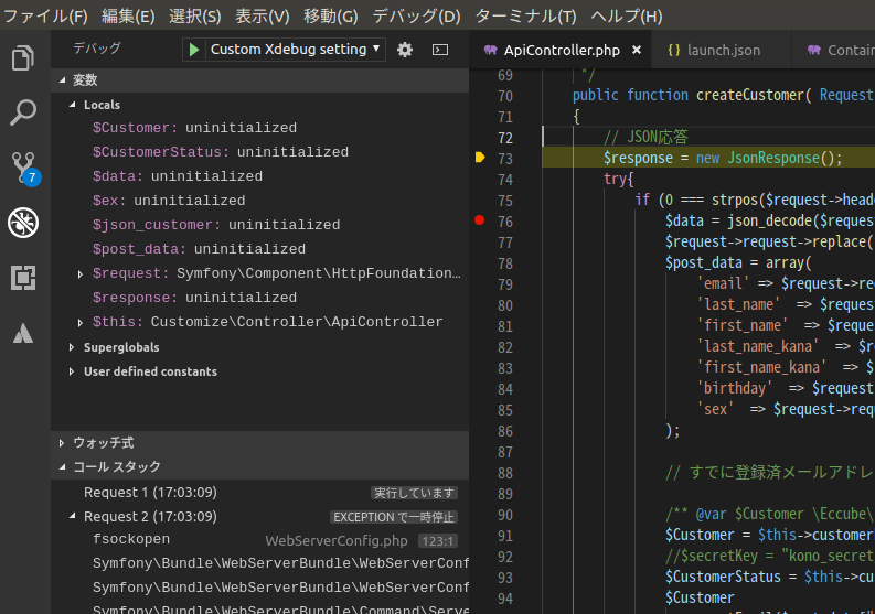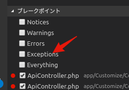 任意の行にブレークポイントを設定して変数など確認できます。(ルーティング処理でも例外発生します)