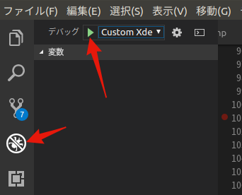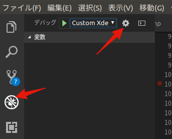 VSCodeのデバッグタブをクリックすると左上に歯車アイコンがあるのでクリックします。するとlaunch.jsonが開くので編集します。